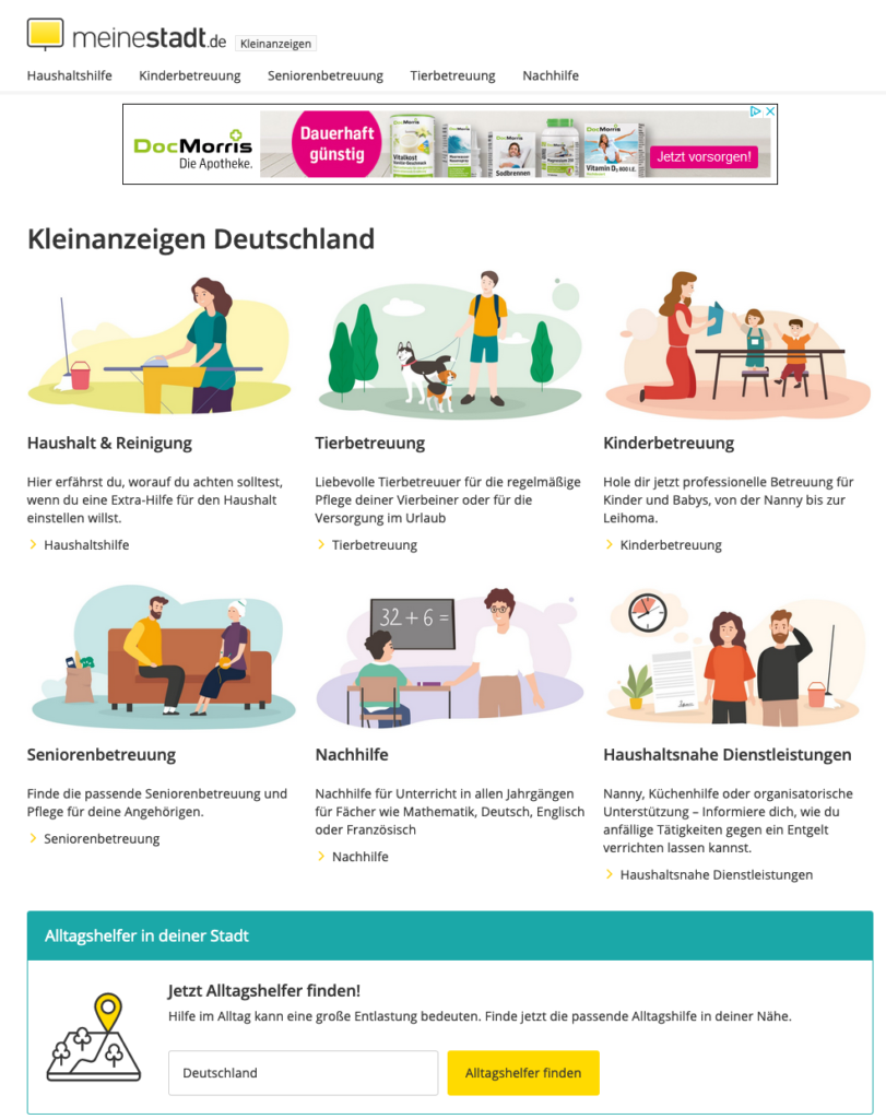 Meinestadt.de wird als Portal überwiegend für das Suchen von Kleinanzeigen genutzt, sodass es sich bei diesem Sektor um einen der beliebtesten der gesamten Seite handelt. Es ist ein Angebot der allesklar.com AG. Die Bandbreite von Kleinanzeigen.meinestadt.de reicht angefangen von den einfachen Haushaltsgeräten bis hin zu den verschiedensten Dienstleistungen, sodass auch die verschiedensten Zielgruppen durch das Angebot angesprochen werden. Durch diese Bandbreite werden die Chancen für jede Anzeige erhöht.