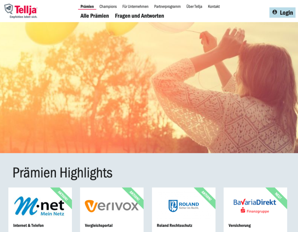 Betreiber binden einfach das Tellja Empfehlungsmarketing Widget ein und bieten so Kunden die Möglichkeit, Freunden und Bekannten ein Produkt oder eine Dienstleistung zu empfehlen. So werden die Bestandskunden zu Multiplikatoren und werden dabei in der Regel durch eine kleine Prämie belohnt.